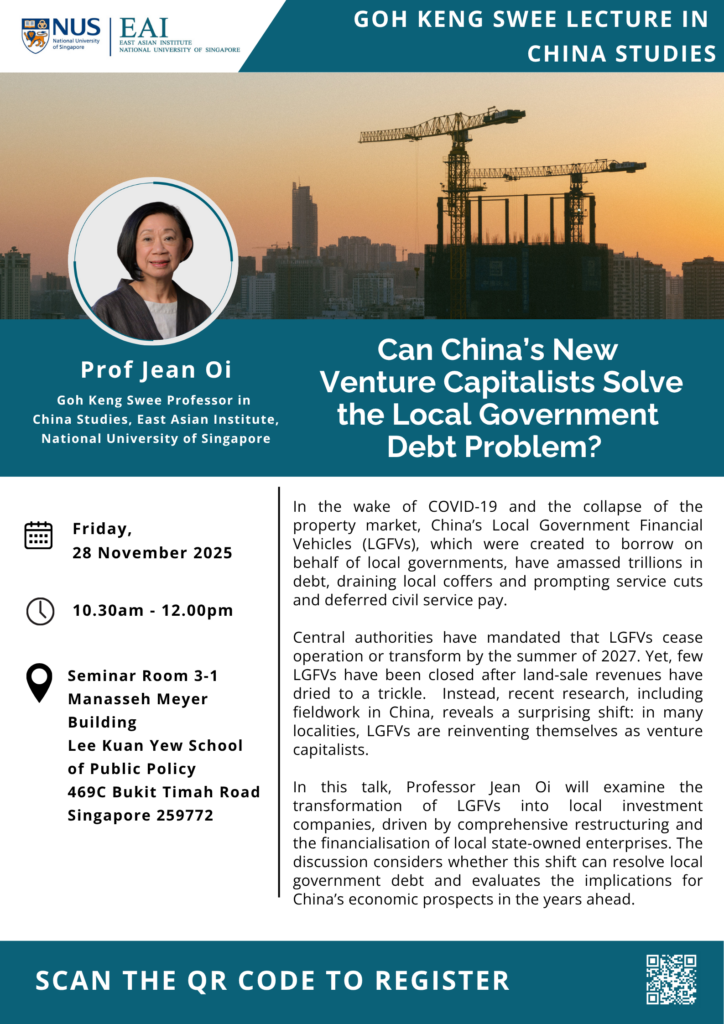 In this talk, Professor Jean Oi will examine the transformation of LGFVs into local investment companies, driven by comprehensive restructuring and the financialisation of local state-owned enterprises. The discussion considers whether this shift can resolve local government debt and evaluates the implications for China’s economic prospects in the years ahead.