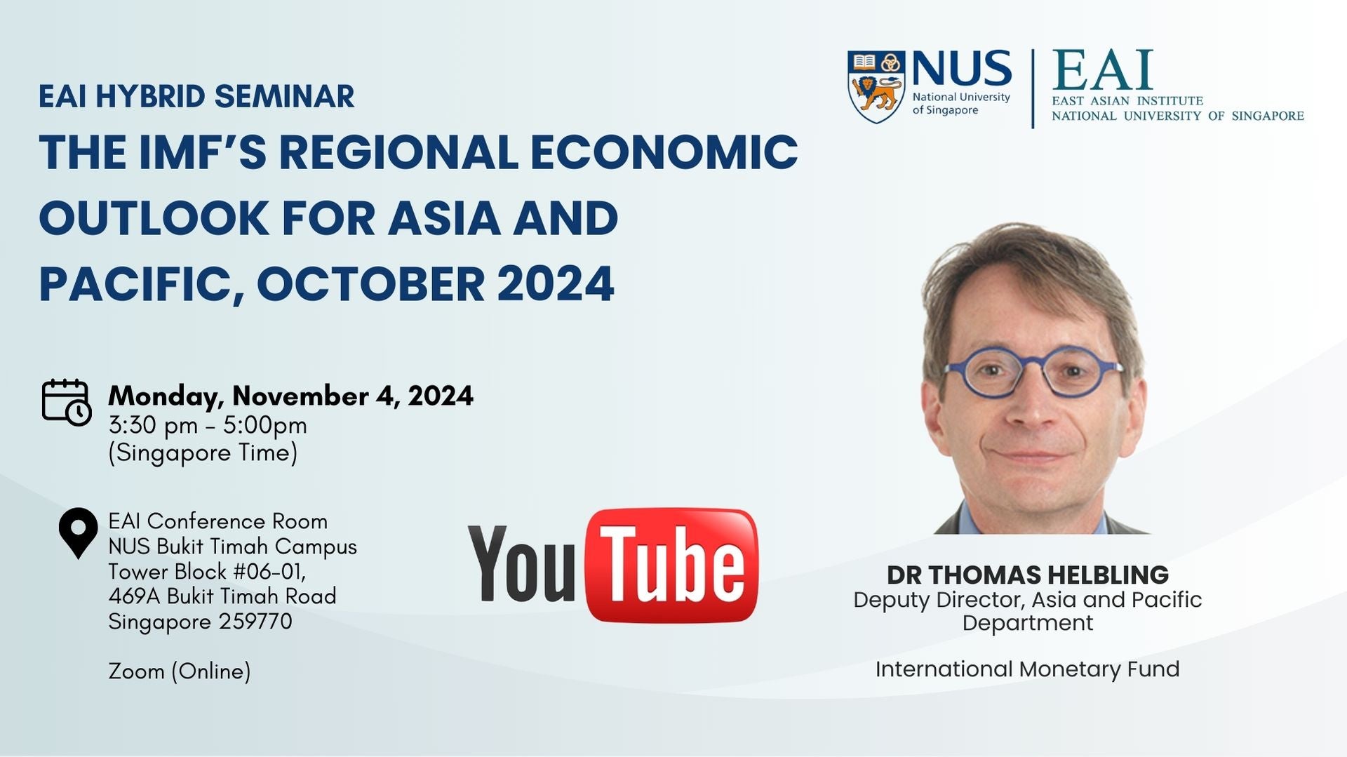 This seminar will discuss the near-term outlook and risks for Asia and the Pacific based on the IMF’s October 2024 Regional Economic Outlook. The focus will be on prospects for major economies in the region (China, India, Japan and Korea) and for regional monetary policy prospects, given recent global disinflation developments. An analytical note on Asia’s structural transformation will also be presented, highlighting the shift towards tradeable services powered by new technologies (such as AI).
