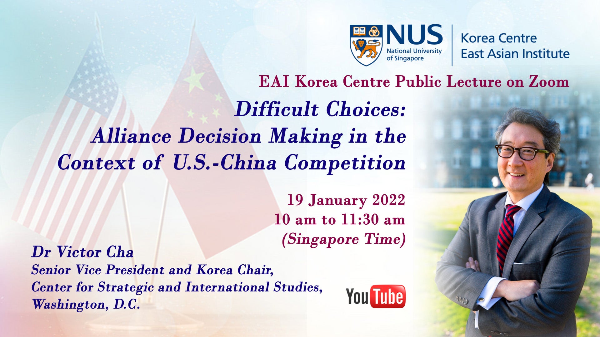 The international system today is characterized by increasing peer competition between the United States and China.  As China has become more assertive in its territorial claims, institution-building, and assertion of political authority, the United States has sought to work with allies and partners to reinforce the Western rules-based international order. US allies are increasingly facing “binary choices” between the U.S. and China. How do they assess such decisions? Under what conditions do they hedge, align with the US, or accommodate China? Dr Cha builds a model to answer this question with regard to key US allies such as South Korea, Japan, and Australia.